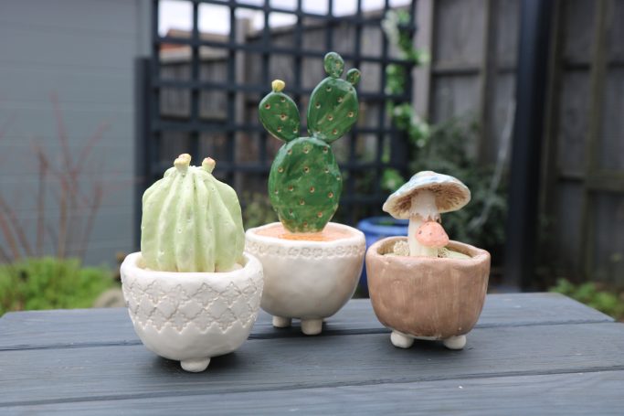 Techniques include pinch pots, adding galleries for lids. Attaching feet. Styling your own choice of cactus.