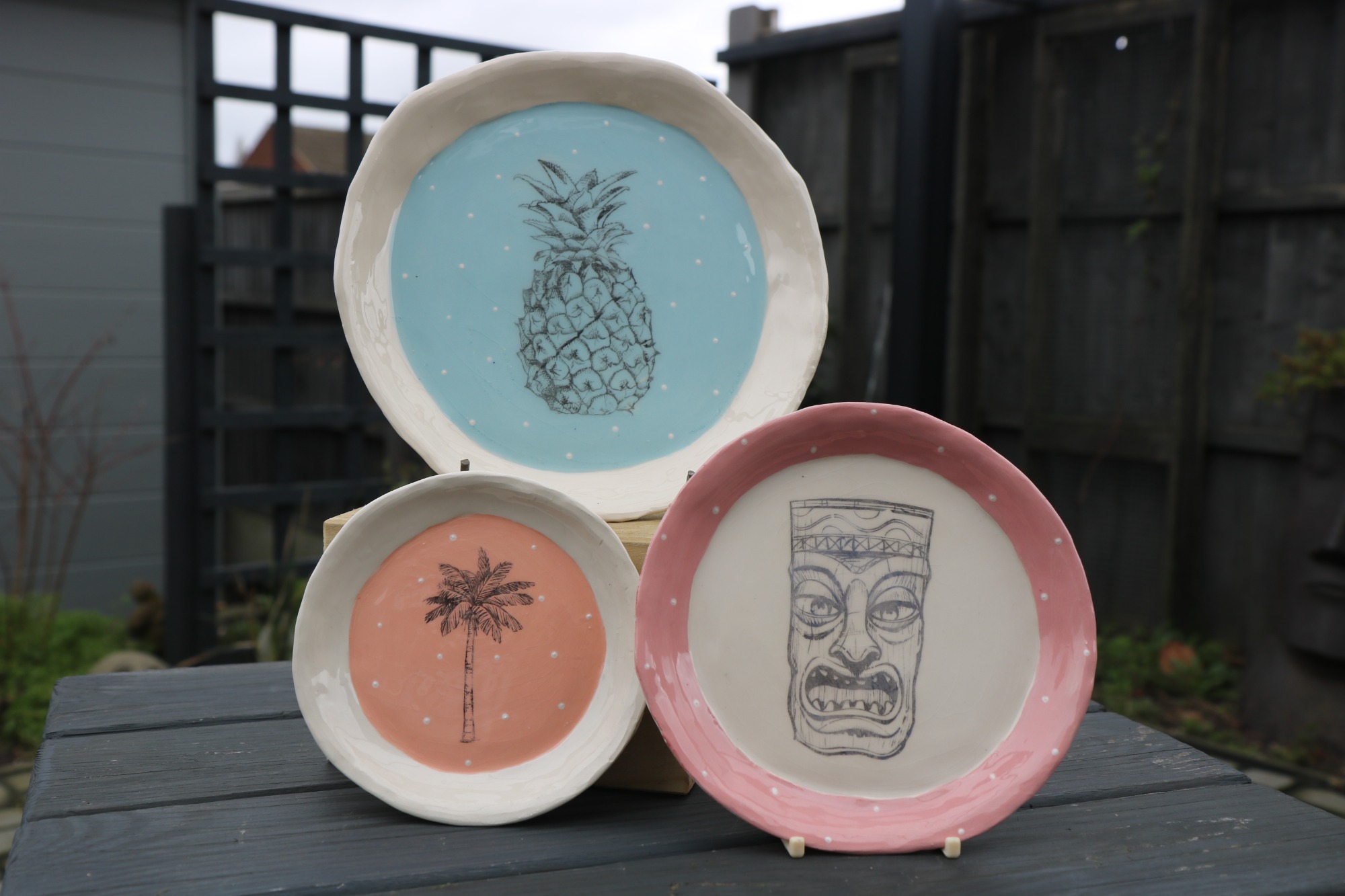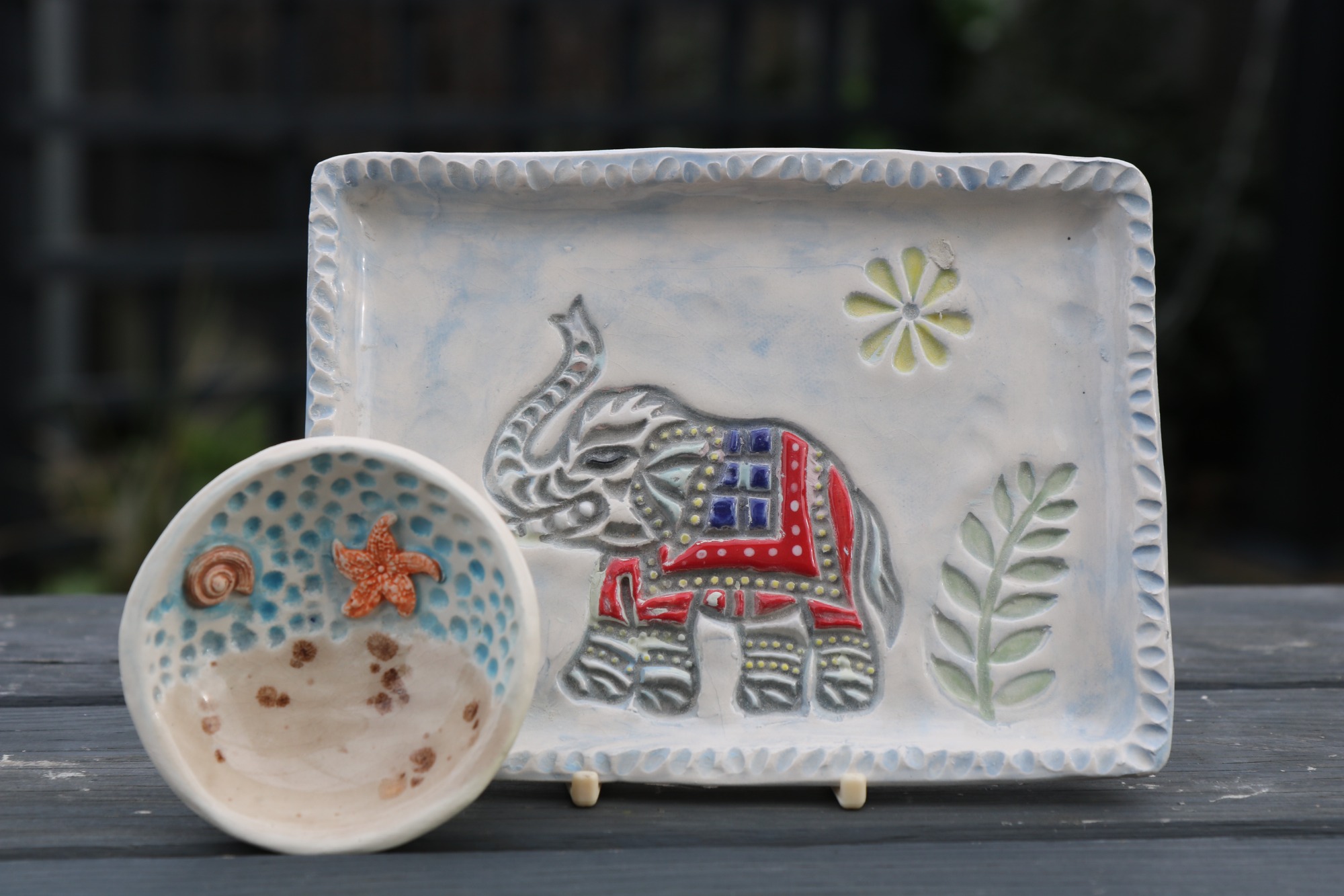 Techniques used: Slab rolling. Decorating using stamps and tools to create your own design. Decoration with coloured slips and glazes.