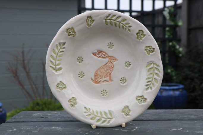 Techniques used: Slab rolling. Mark making with various tools & stamps to your choice of design. Sprigging. Decorating.